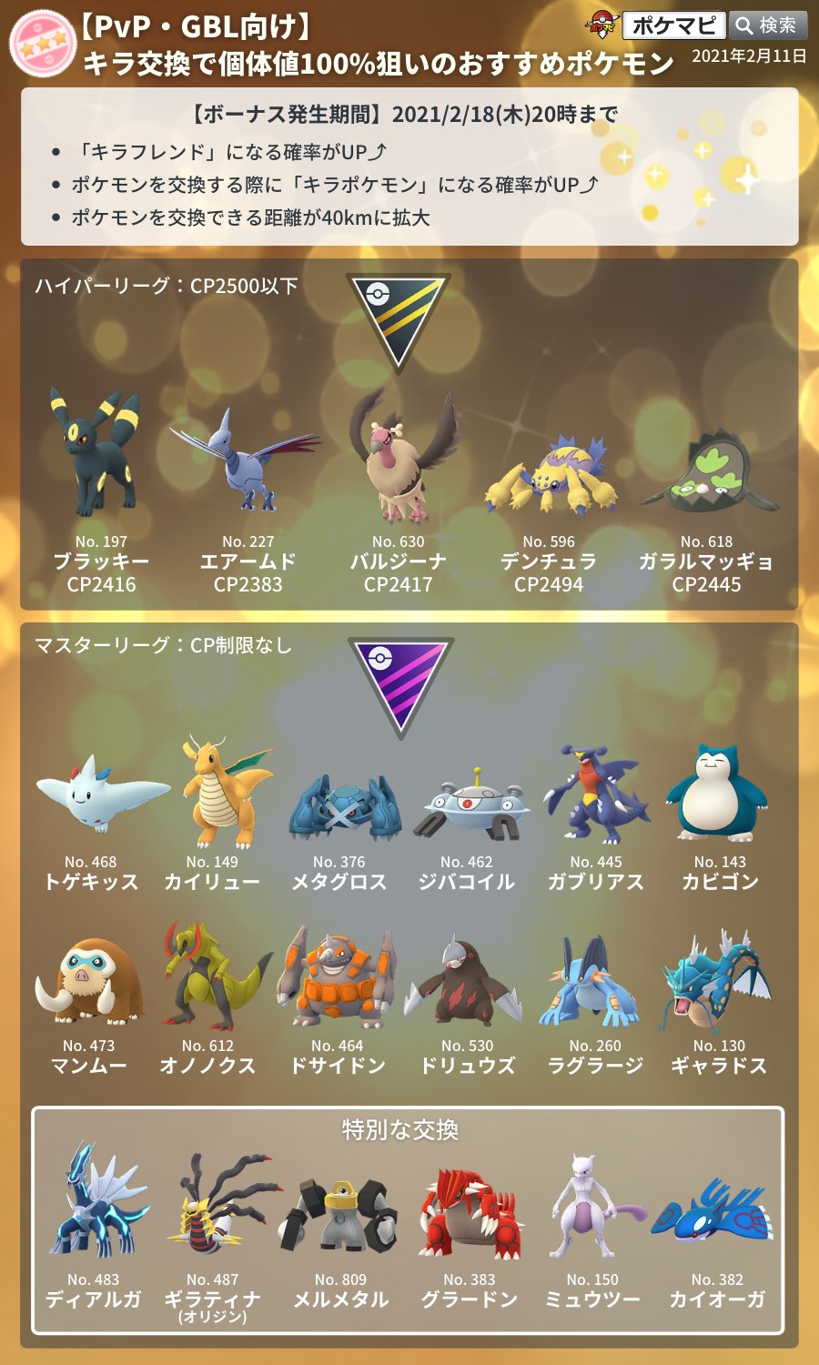 ポケモンgo攻略情報 ポケマピ 交換距離拡大は21 2 18 木 時まで キラフレ キラ交換の確率up 交換できる距離が40 に拡大 キラ交換で個体値100 に近いほどpvpで活躍できるポケモンをまとめてみました 交換画像ジェネレーター T Co